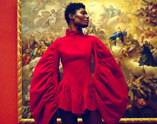 Fotoshooting für die Zeitschrift ACHTUNG anlässlich des BERLINER SALONS in der Gemäldegalerie 2025, Entwurf Leya zu Stolberg, mit Gemälde von Paolo de Matteis, Foto: Ralph Mecke