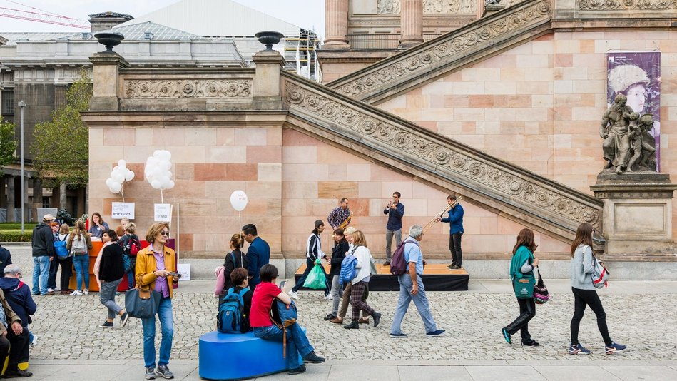 Im Laufe des Nachmittags werden zahlreiche Führungen kostenfrei angeboten. Zusätzlich bietet die Alte Nationalgalerie unterschiedliche Audiotouren in verschiedenen Sprachen für Kinder, Erwachsene – auch in Deutscher Gebärdensprache oder als Audiodeskription an.