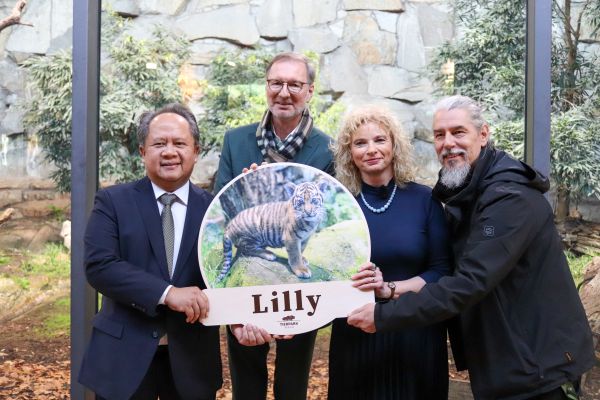 Bei der feierlichen Namensverkündung im Regenwaldhaus waren neben der Patin, der Bezirksstadträtin von Lichtenberg, auch Vertreter der indonesischen Botschaft zugegen, um diesen besonderen Moment mitzuerleben. „Sumatra-Tiger gelten als die seltensten Großkatzen der Welt. Durch Lebensraumverlust und menschliche Eingriffe ist ihre Population in der Wildnis auf nur noch etwa 400 bis 600 Tiere geschrumpft“, erklärt Zoo- und Tierparkdirektor Dr. Andreas Knieriem. „Mayang und Lilly sind bereits für die Gäste des Tierparks zu sehen. Auch wenn Mutter und Jungtier weiterhin viel Zeit für Zweisamkeit benötigen, werden die Erkundungsausflüge ins Innengehege inzwischen immer häufiger.“ Bei Sumatra-Tigern liegt die Aufzucht der Jungtiere vollständig in der Verantwortung der Mutter.