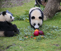 Die drolligen Panda-Zwillinge Leni und Lotti stellen voller Freude ihre Kletterkünste unter Beweis, während Mutter Meng Meng sich bambuskauend die Frühlingssonne auf den Bauch scheinen lässt.